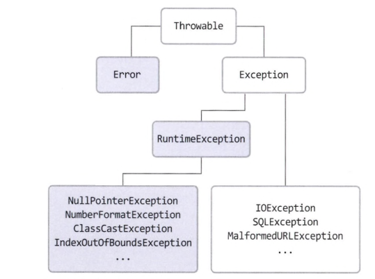 예를 들면, NullPointerException 과 같이 객체가 필요한 경우에 null 값이 대입됐을때 던져지는 예외이다.