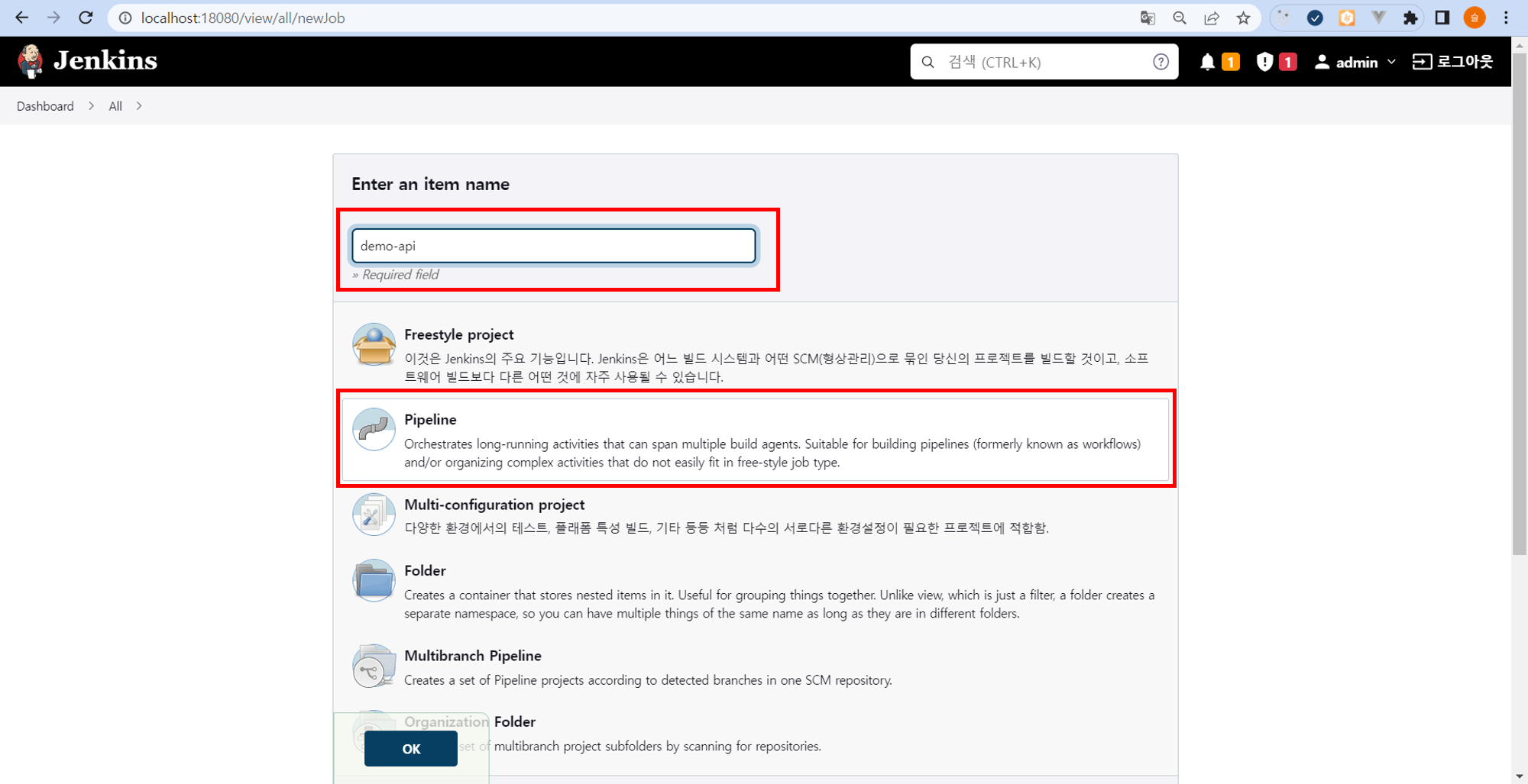 Jenkins 가 http://localhost:18080 으로 떠있는 상황
