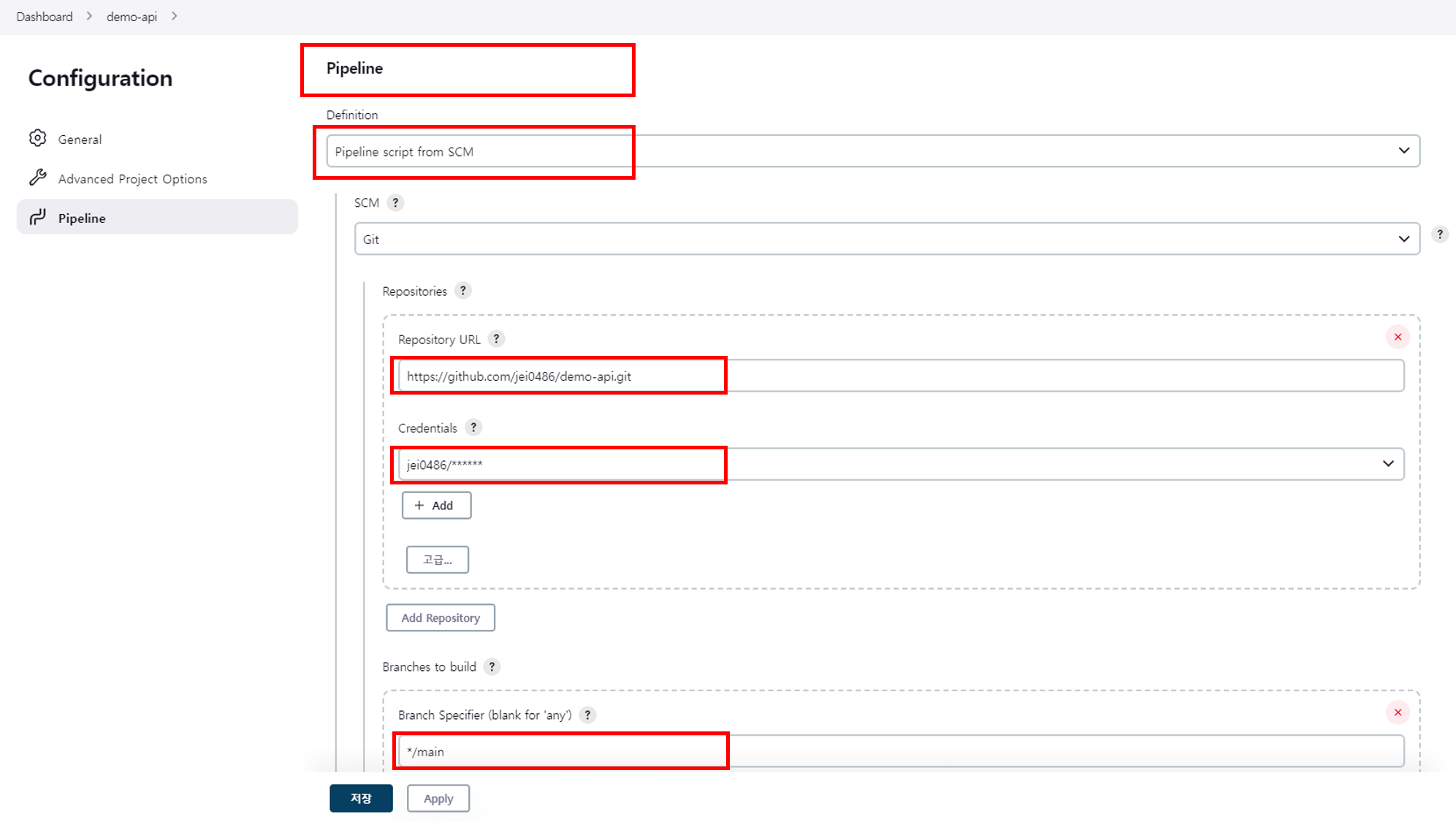 - Jenkinsfile 이 위치한 Git Repository 정보를 입력하면 됨