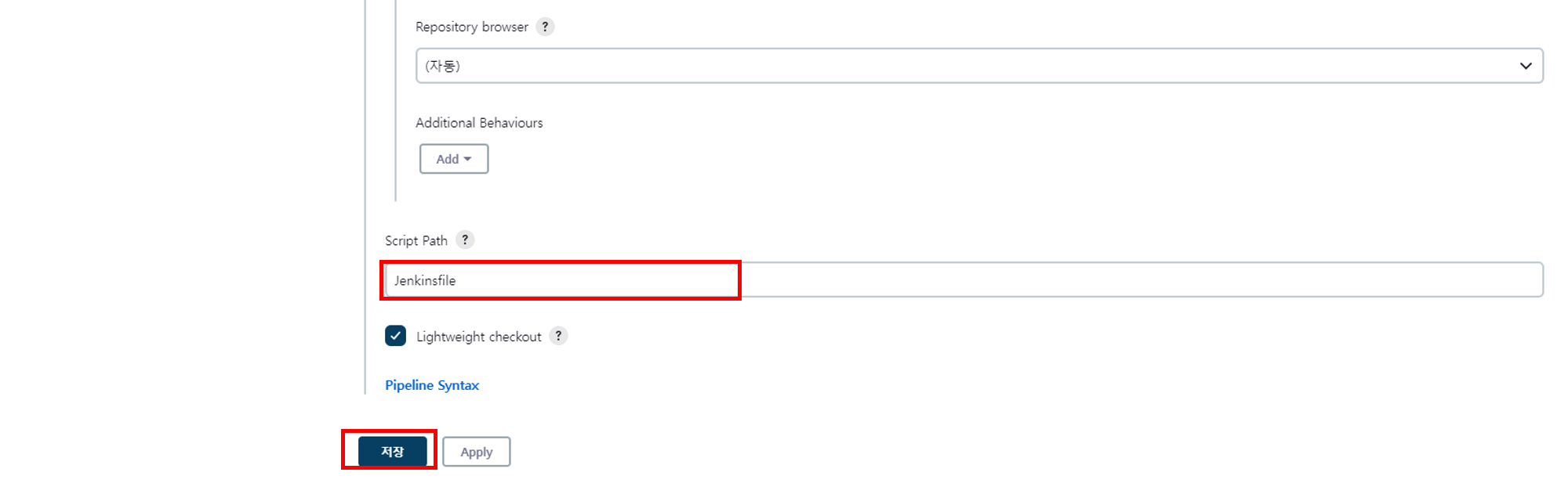 Pipeline script 와 Pipeline script from SCM 중 선택하여 정보를 입력한다.