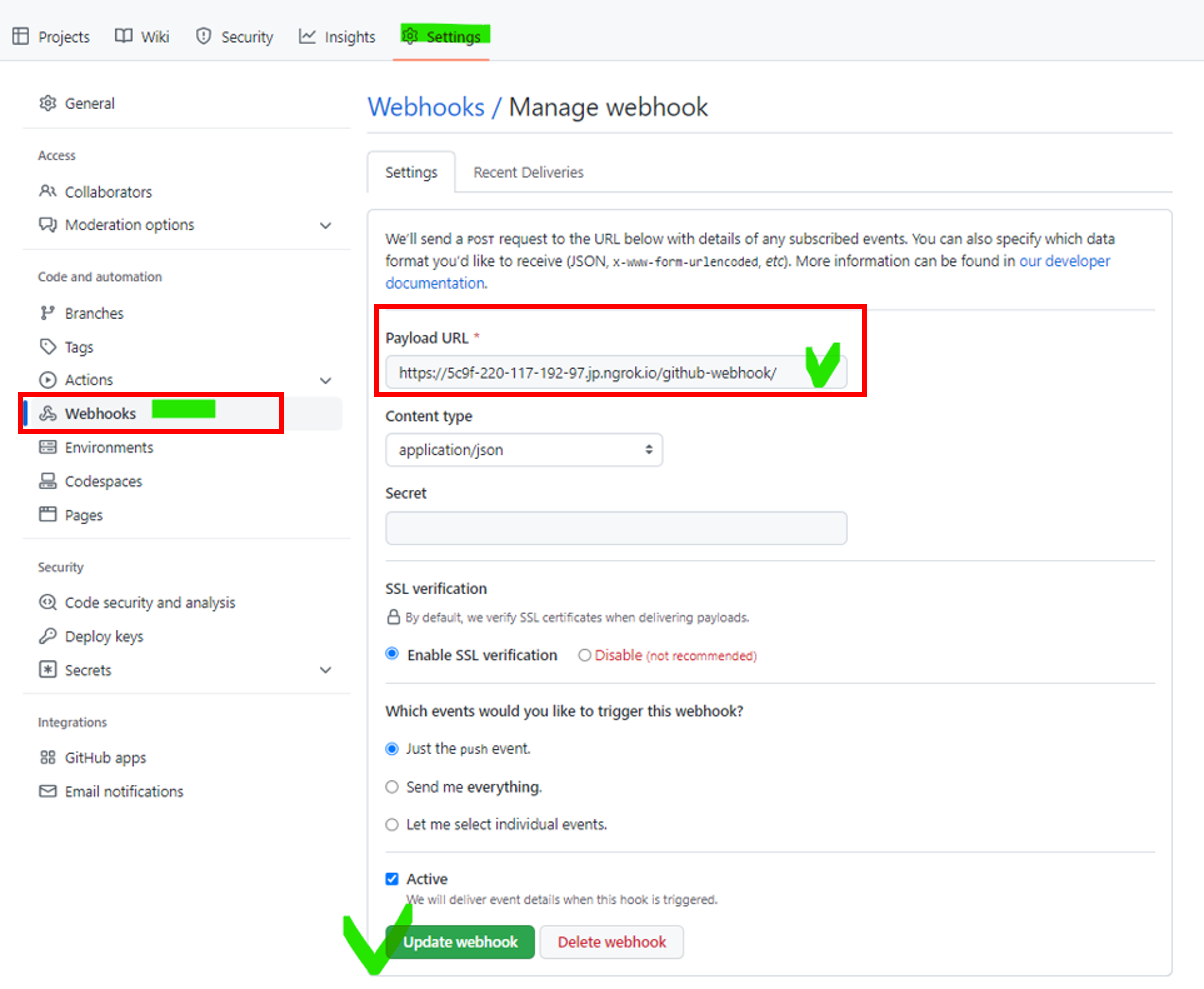 - Payload URL : https://5c9f-220-117-192-97.jp.ngrok.io/github-webhook/ 입력