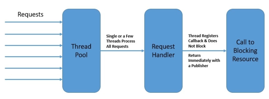 - 모든 요청들은 이벤트로 처리되기 시작하고 이벤트 핸들러(Event Handler) 에 등록이 된다. 요청 후 응답이 없는 경우에는 이벤트 핸들러에 등록만 되고 어떤 쓰레드도 점유하지 않을 수 있다.
